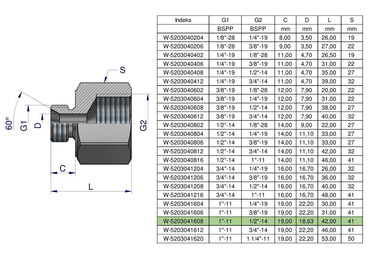Tulejka różnicowa hydrauliczna calowa AB 1″GZ x 1/2″GW BSP Waryński. Elementy złączne zostały zaprojektowane i wykonane zgodnie z obowiązującymi normami, które szczegółowo opisują wymagania jakościowe i wymiarowe. Są kompatybilne z elementami złącznymi innych renomowach producentów hydrauliki siłowej.