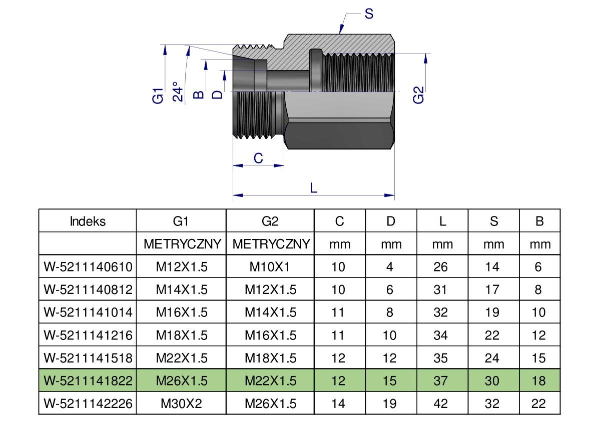 Tulejka różnicowa hydrauliczna metryczna AB M26x1.5 18L GZ x M22x1.5 GW Waryński. Elementy złączne zostały zaprojektowane i wykonane zgodnie z obowiązującymi normami, które szczegółowo opisują wymagania jakościowe i wymiarowe. Są kompatybilne z elementami złącznymi innych renomowach producentów hydrauliki siłowej.