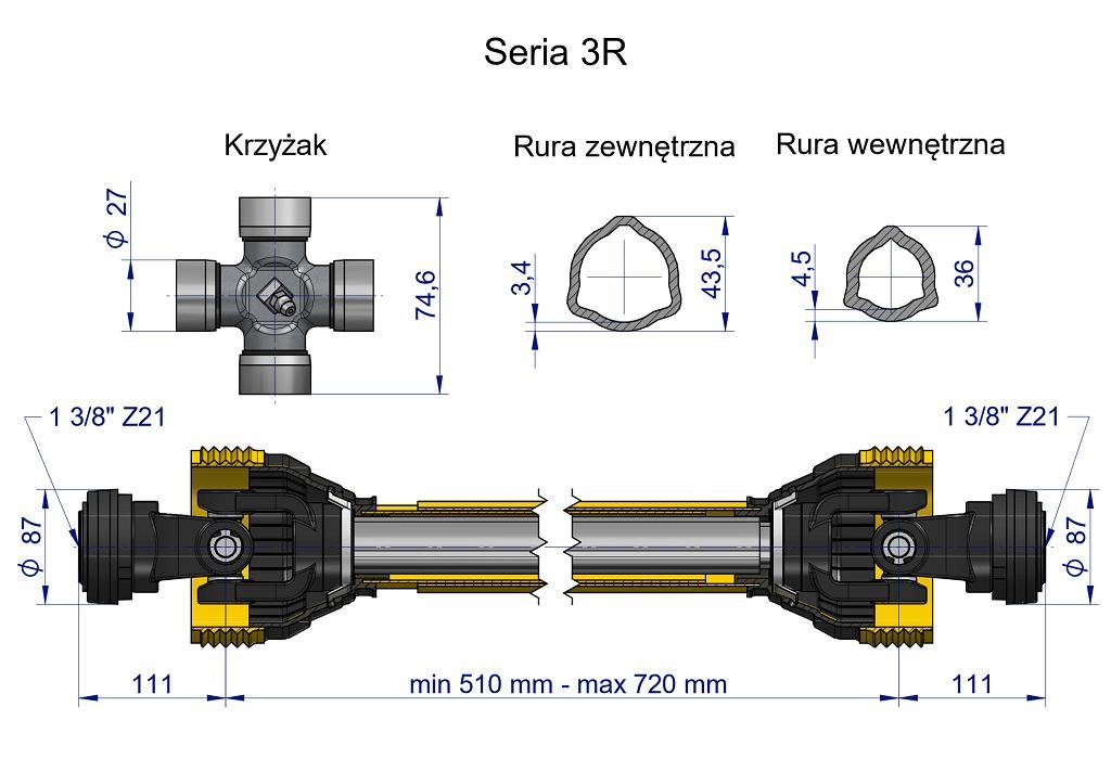 Wał przegubowo-teleskopowy 510-720mm 460Nm Z21 z dwóch stron CE 2020 seria 3R WARYŃSKI [W3B2B2510]