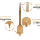 Wiertło do drewna płaskie – łopatkowe marki TEGER / przeznaczone do wiercenia dużych otworów w drewnie, płycie meblowej, tworzywach sztucznych, płycie gipsowej oraz gazobetonie. Hartowany wierzchołek z dwoma krawędziami skrawającymi zapewnia doskonałe centrowanie wiertła. Wykonanie z wysokogatunkowej stali węglowej oraz szlifowane ostrze pozwala na precyzyjną pracę wiertła oraz zmniejsza wibrację.