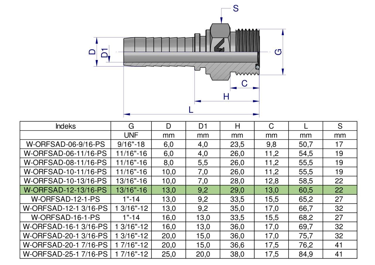 Zakucie hydrauliczne ORFSAD DN13 13/16″-16 PREMIUM Waryński ( sprzedawane po 5 ) [W-ORFSAD-12-13/16-PS]