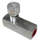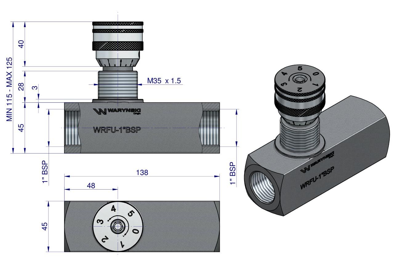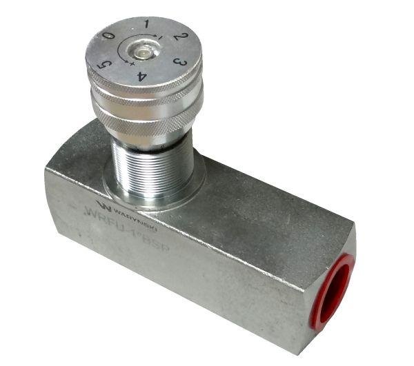 Zawór dławiąco-zwrotny WRFU 90 z gwintem wewnętrznym 1″BSP Waryński. Zadaniem zaworów dławiąco-zwrotnych jest oddziaływanie na wartość strumienia cieczy roboczej dostarczanej do odbiornika. Dzięki regulacji/zmianie natężenia przepływu oleju steruje się np. prędkością roboczą siłowników hydraulicznych lub silników hydraulicznych, które są zasilane pompą hydrauliczną o stałej wydajności. Dławienie działa tylko w jednym kierunku. W kierunku przeciwnym wbudowany zawór zwrotny (otwierający się przy ciśnieniu 0,5 bar) umożliwia niedławiony przepływ powrotny. Powtarzalność ustawienia można sprawdzić na skali umieszczonej na pokrętle. Strumień objętości zależy od różnicy ciśnień i od lepkości oleju hydraulicznego. Zaprojektowane są zgodnie z wymogami wymiarowymi i jakościowymi, które określają szczegółowo charakterystykę pracy i wymiary. Dzięki mocnej kontrukcji nadają się do zastosowań podczas trudnych warunków pracy w maszynach rolniczych i budowlanych.