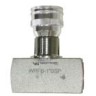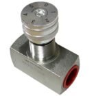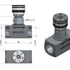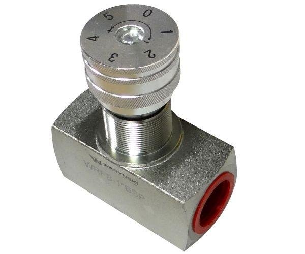 Zawór dławiący WRFB 90 z gwintem wewnętrzym 1″BSP Waryński. Zadaniem zaworów dławiących jest oddziaływanie na wartość strumienia cieczy roboczej dostarczanej do odbiornika. Dzięki regulacji/zmianie natężenia przepływu oleju steruje się np. prędkością roboczą siłowników hydraulicznych lub silników hydraulicznych, które są zasilane pompą hydrauliczną o stałej wydajności. Dławienie działa w obu kierunkach przepływu. Powtarzalność ustawienia można sprawdzić na skali umieszczonej na pokrętle. Strumień objętości zależy od różnicy ciśnień i od lepkości oleju hydraulicznego. Zaprojektowane są zgodnie z wymogami wymiarowymi i jakościowymi, które określają szczegółowo charakterystykę pracy i wymiary. Dzięki mocnej kontrukcji nadają się do zastosowań podczas trudnych warunków pracy w maszynach rolniczych i budowlanych.