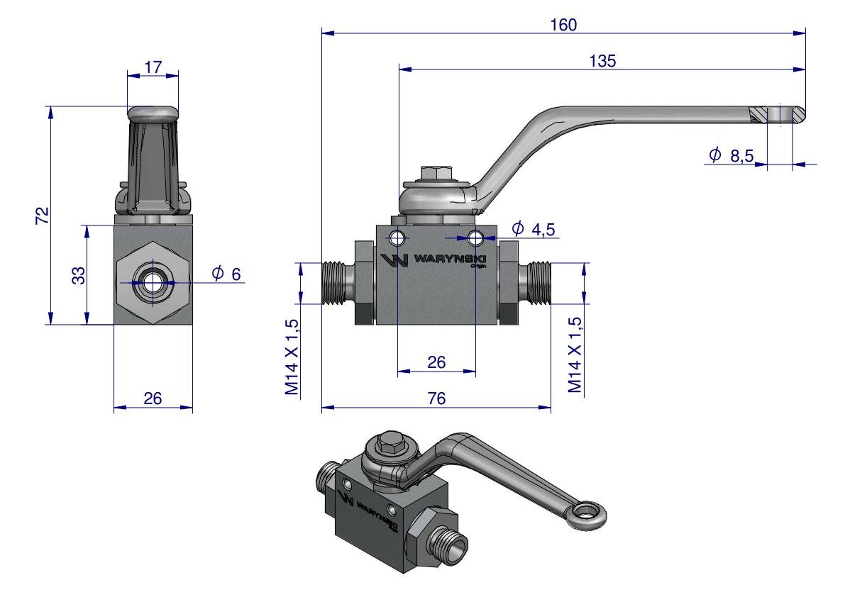Zawór kulowy hydrauliczny 2-drogowy 2/2 M14x1.5 08L z otworami mocującymi 500 bar Waryński [WKH-08L-M14X1.5]