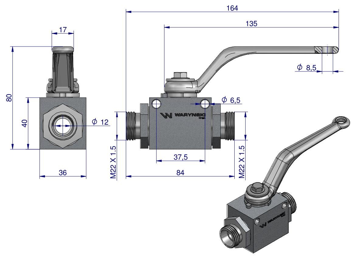 Zawór kulowy hydrauliczny 2-drogowy 2/2 M22x1.5 15L z otworami mocującymi 500 bar Waryński [WKH-15L-M22X1.5]