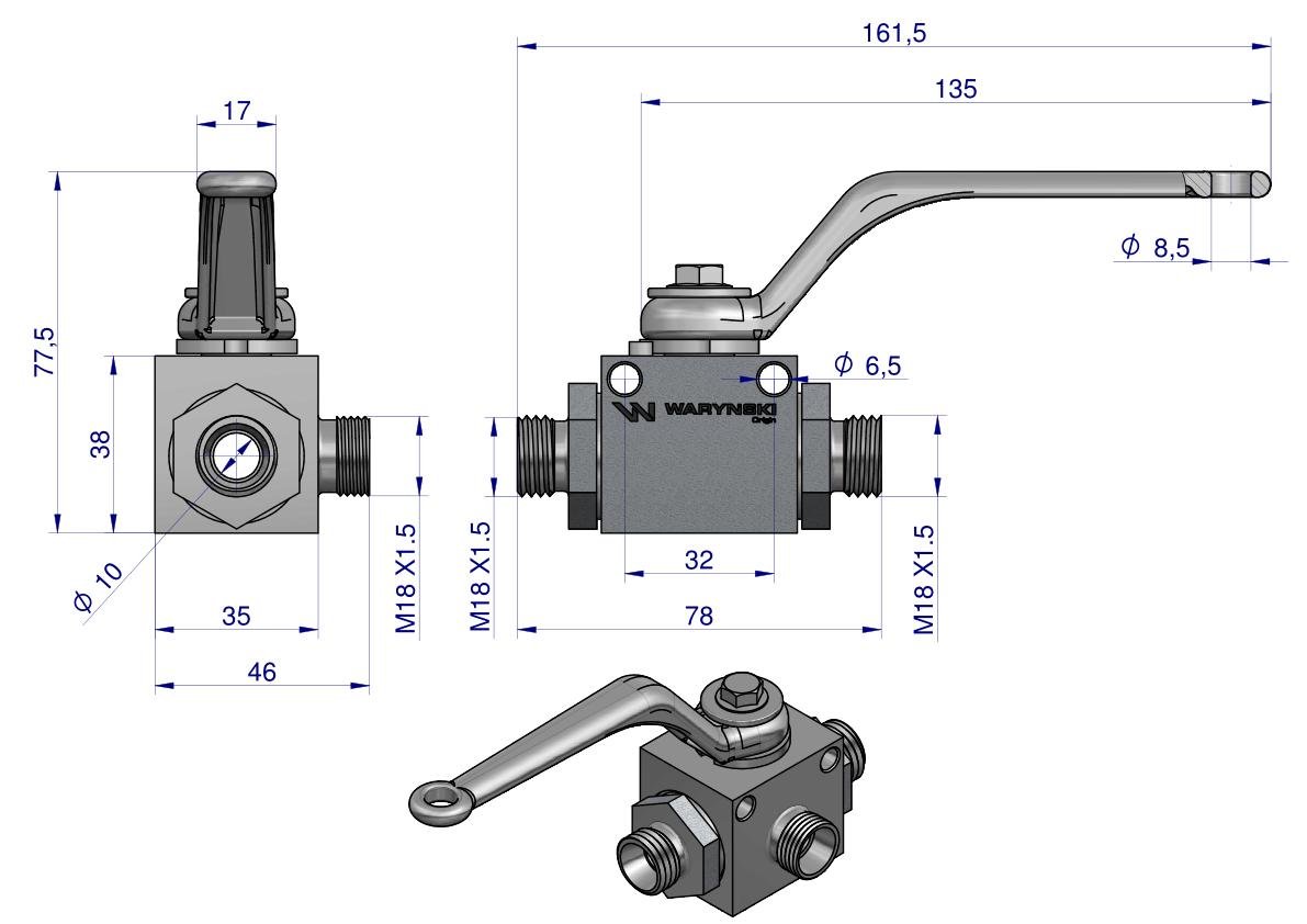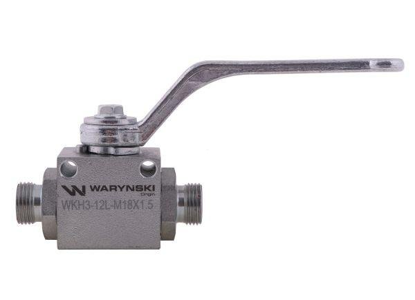 Zawór kulowy hydrauliczny 3-drogowy 3/2 M18x1.5 12L z otworami mocującymi 500 bar Waryński [WKH3-12L-M18X1.5]