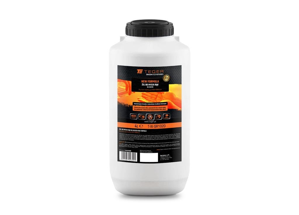Żel do mycia rąk na sucho NEW FORMULA / TEGER to profesjonalna, innowacyjna formuła ze ścierniwem naturalnym przeznaczona do mycia silnie zabrudzonych rąk bez użycia wody. Doskonale usuwa smary, przepracowane oleje, lakiery oraz inne trudne do usunięcia zabrudzenia. Skuteczne działanie łagodnych substancji myjących oraz naturalne ścierniwo pomagają usuwać zanieczyszczenia. Starannie dobrane składniki ochronne: emolienty i gliceryna, dzięki doskonałej recepturze chronią i pielęgnują skórę rąk. Ścierniwo naturalne, konsystencja półpłynna, doskonale chroni, nawilża i natłuszcza skórę rąk, pozostawiając przyjemny zapach. Przebadana dermatologicznie, przyjazny środowisku ulega biodegradacji, nie zapycha kanalizacji