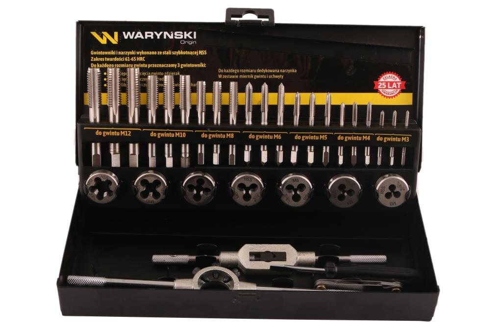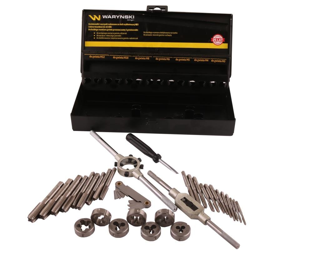 Zestaw narzynek i gwintowników M3-M12 ze stali HSS stosowanej do narzedzi skrawających, z dodatkiem kobaltu i wolframu zawierający 32 elementów Waryński