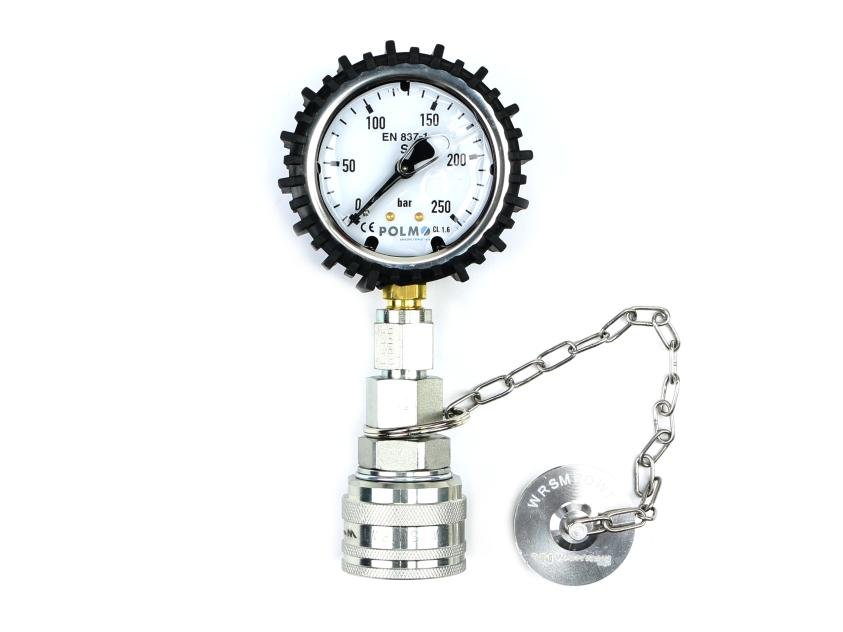 Zestaw pomiarowy ciśnienia hydrauliki z manometrem 250 bar wtyczka skręcana rolnicza Waryński. Zestaw do pomiaru ciśnienia znajduje szerokie zastosowanie w diagnostyce (między innymi pomp hydraulicznych) w wielu gałęziach przemysłu, rolnictwie, hydraulice mobilnej. Zestaw złożony z jakościowych komponentów wytrzymujących wysokie ciśnienia robocze.