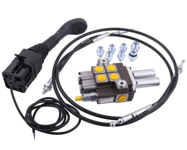 W skład zestawu wchodzą: 1. JOYSTIKK (Joystick z przyciskiem na kulkę)x 1szt 2. W-ROZ40L/2L (Rozdzielacz hydrauliczny dwusekcyjny (2) 40L sterowany joystickiem Waryński) x 1szt 3. W-L1500KS (Linka do sterowania rozdzielaczem na kulkę (stalowa) L-1500mm Waryński) x 2szt 4. W-XGE-12LR-3/8ED (Złącze hydrauliczne proste BB przyłączka M18x1.5 12L x 3/8″ BSP z uszczelnieniem XGE12LR-3/8″ED Waryński) x 5szt 5. W-XGE-12LR-1/2ED (Złącze hydrauliczne proste BB przyłączka M18x1.5 12L x 1/2″ BSP z uszczelnieniem XGE12LR-1/2″ED Waryński)x 1szt 6. W-XGE-15LR-1/2ED (Złącze hydrauliczne proste BB (przyłączka) M22x1.5 15L x 1/2″ BSP z uszczelnieniem XGE15LR-1/2″ED Waryński) x 1szt