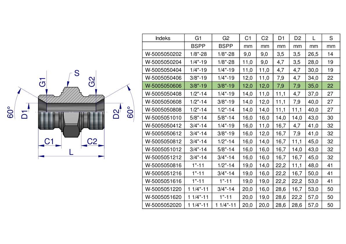 Złączka hydrauliczna calowa BB 3/8″ BSP Waryński ( sprzedawane po 10 ) [W-5005050606]