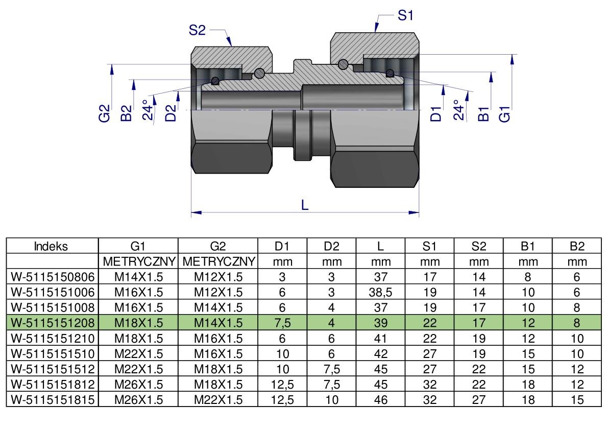 Złączka hydrauliczna metryczna AA M18x1.5 12L x M14x1.5 08L Waryński ( sprzedawane po 2 ) [W-5115151208]