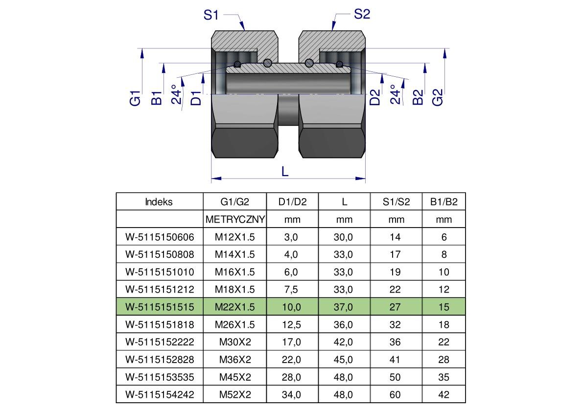 Złączka hydrauliczna metryczna AA M22x1.5 15L Waryński ( sprzedawane po 5 ) [W-5115151515]