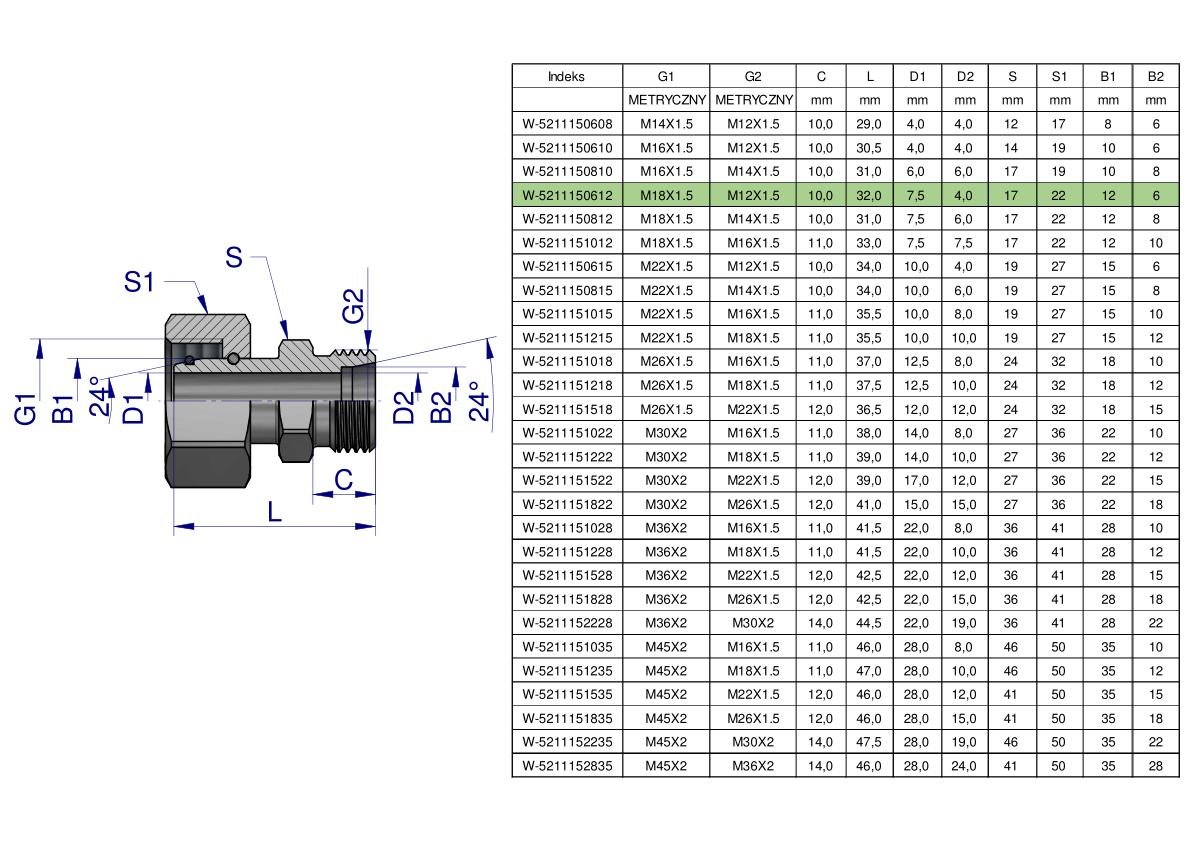 Złączka hydrauliczna metryczna AB (XKOR) A-M18x1.5 12L / B-M12x1.5 06L Waryński. Elementy złączne zostały zaprojektowane i wykonane zgodnie z obowiązującymi normami, które szczegółowo opisują wymagania jakościowe i wymiarowe. Są kompatybilne z elementami złącznymi innych renomowach producentów hydrauliki siłowej.