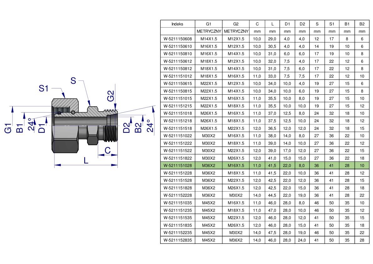 Złączka hydrauliczna metryczna AB (XKOR) A-M36x2 28L / B-M16x1.5 10L Waryński [W-5211151028]