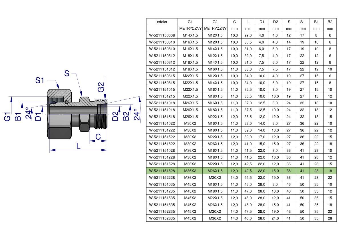 Złączka hydrauliczna metryczna AB (XKOR) A-M36x2 28L / B-M26x1.5 18L Waryński [W-5211151828]