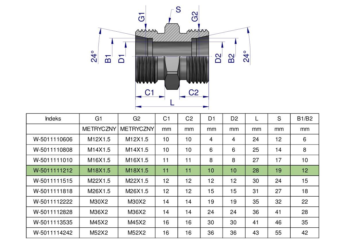 Złączka hydrauliczna metryczna BB M18x1.5 12L (XG) Waryński ( sprzedawane po 10 ) [W-5011111212]