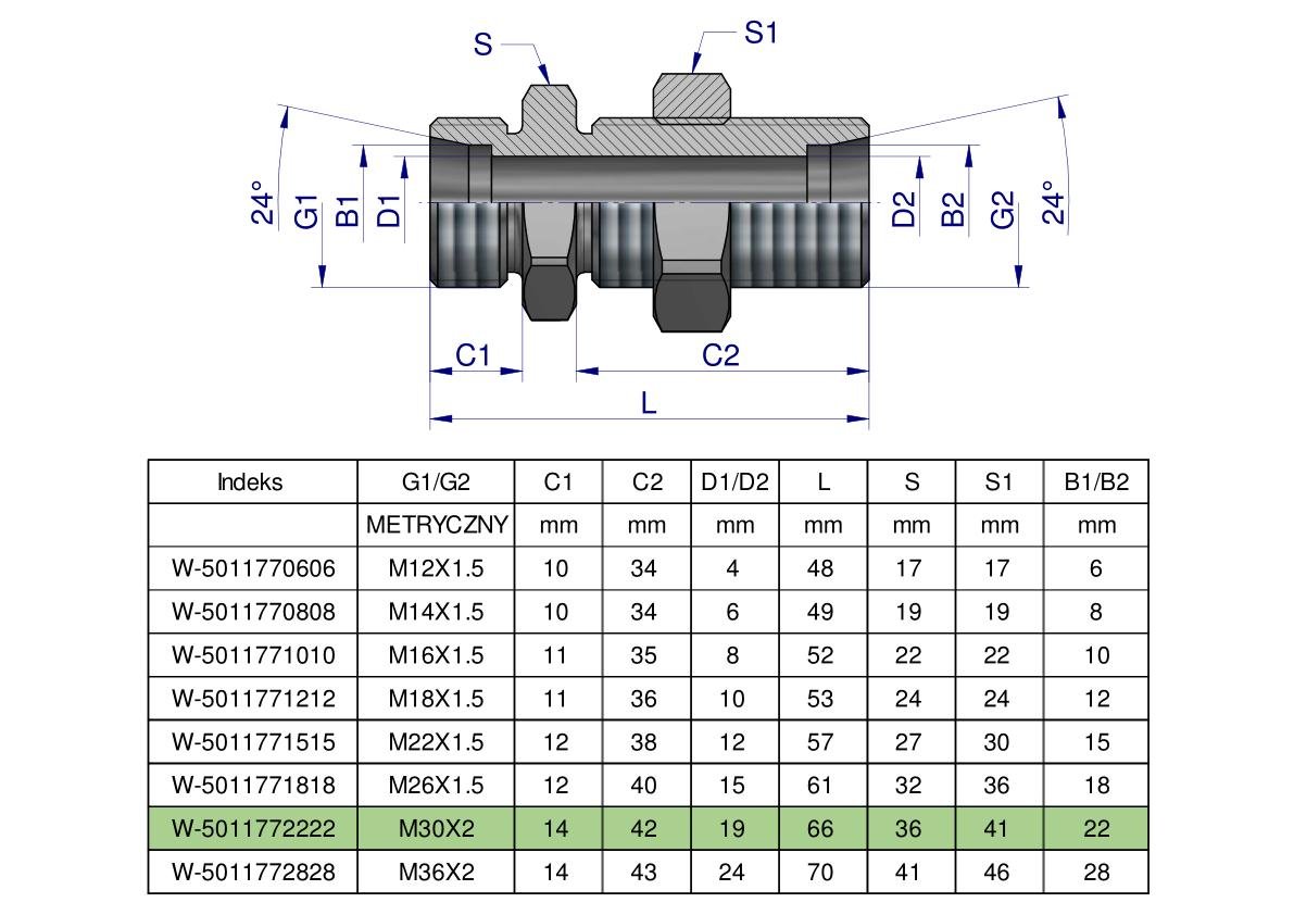 Złączka hydrauliczna metryczna grodziowa BB M30x2 22L z przeciwnakrętką (XSV) Waryński [W-5011772222]