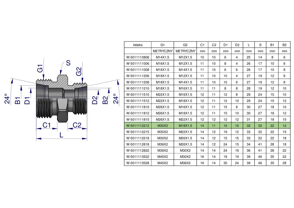 Złączka hydrauliczna redukcyjna metryczna BB M30x2 22L / M18x1.5 12L (XG) Waryński. Elementy złączne zostały zaprojektowane i wykonane zgodnie z obowiązującymi normami, które szczegółowo opisują wymagania jakościowe i wymiarowe. Są kompatybilne z elementami złącznymi innych renomowach producentów hydrauliki siłowej.