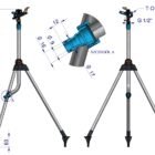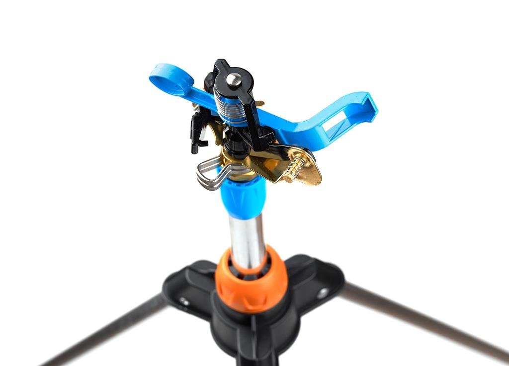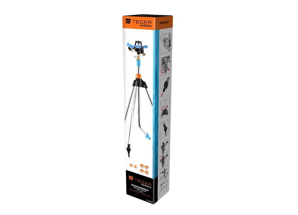 Zraszacz ogrodowy – impulsowy – trójnożny (70-95cm) / TEGER / Wysokiej jakości zraszacz ogrodowy, na podstawie szpilki, z możliwością ustawienia stopniowej regulacji sektora zraszania od 30º do 360º. Doskonały na większe tereny rekreacyjne, do ogrodów wypoczynkowych. Specjalnie zaprojektowana precyzyjna dysza z mosiądzu zabezpiecza przed korozją. Idealnie nadaje się do codziennego nawadniania trawników bądź ogródków z możliwością szeregowego połączenia z innymi zraszaczami. Metalowa długa szpilka ułatwia osadzenie zraszacza w gruncie i zapewnia jego stabilność nawet przy dużym ciśnieniu wody. Regulacja konta podlewana sprawia, że podlewanie jest wydajniejsze i bardziej kontrolowane. Zasięg 14m / 610 m2 (przy 4 bar)