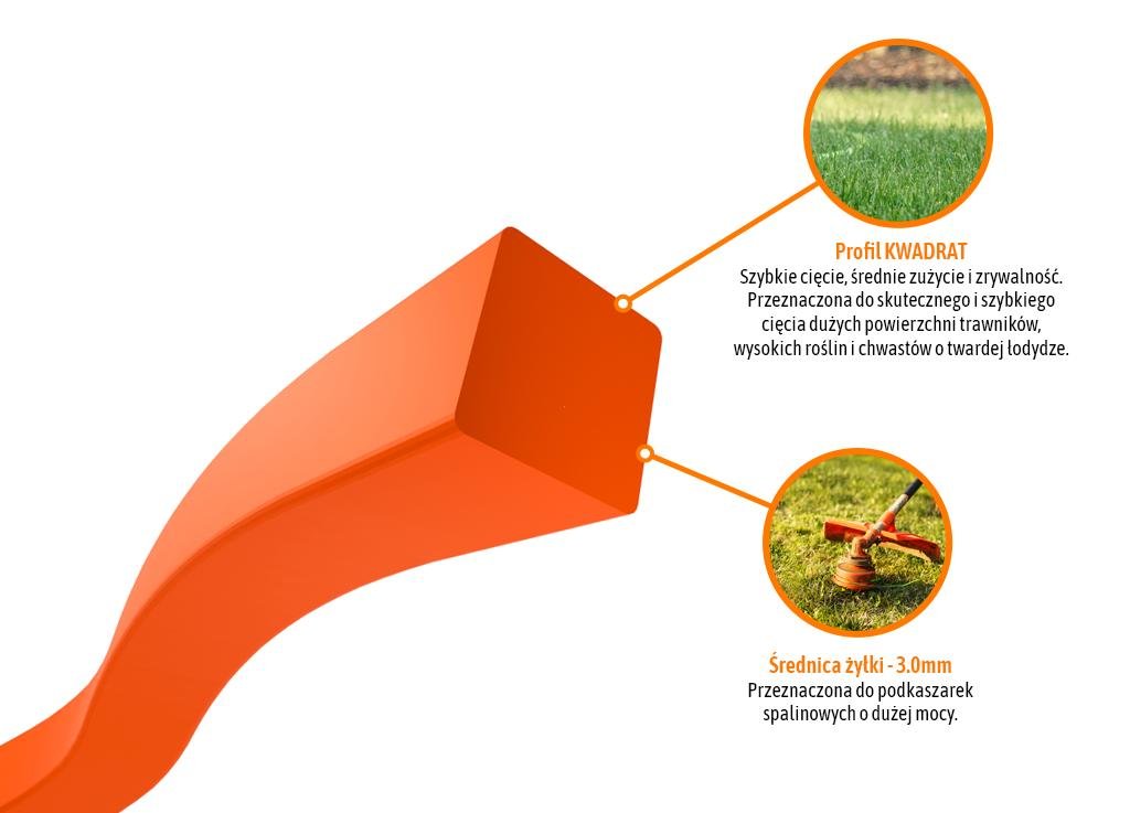 Żyłka tnąca do podkaszarek / Kwadrat / 3,0 mm / 15 m / TEGER przeznaczona do podkaszarek oraz kos spalinowych, jeszcze bardziej trwała, wytrzymała i nierozciągliwa. Charakteryzuje się doskonałą wytrzymałością, dzięki czemu jest bardziej wydajna od zwykłych żyłek. Optymalny przekrój żyłki zapewnia równe i wydajne działanie podczas pracy, materiał użyty podczas produkcji żyłki jest trwały, mocny i odporny na ścieranie. Przekrój żyłki zapewnia optymalne działanie podkaszarki podczas koszenia.